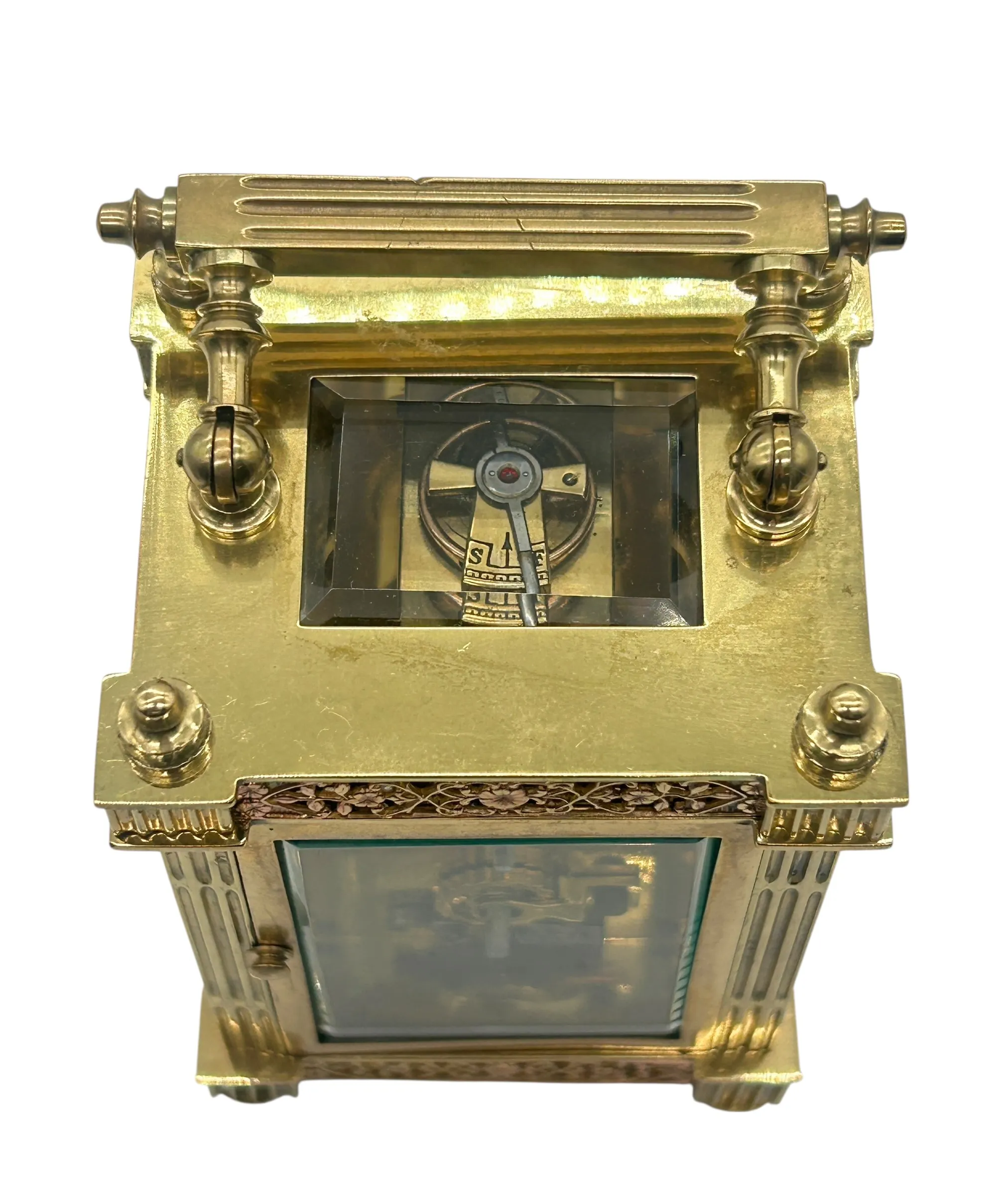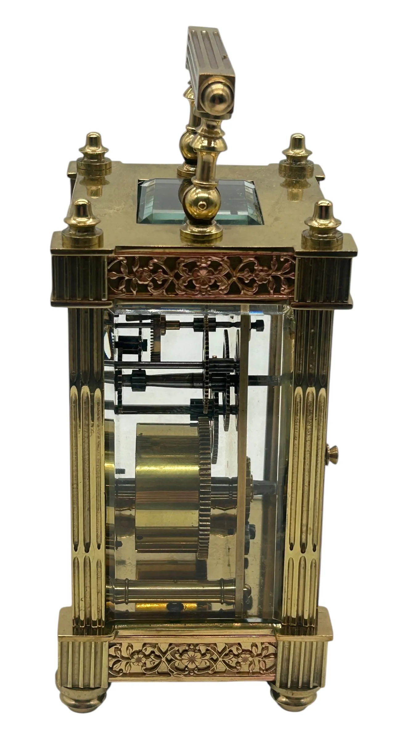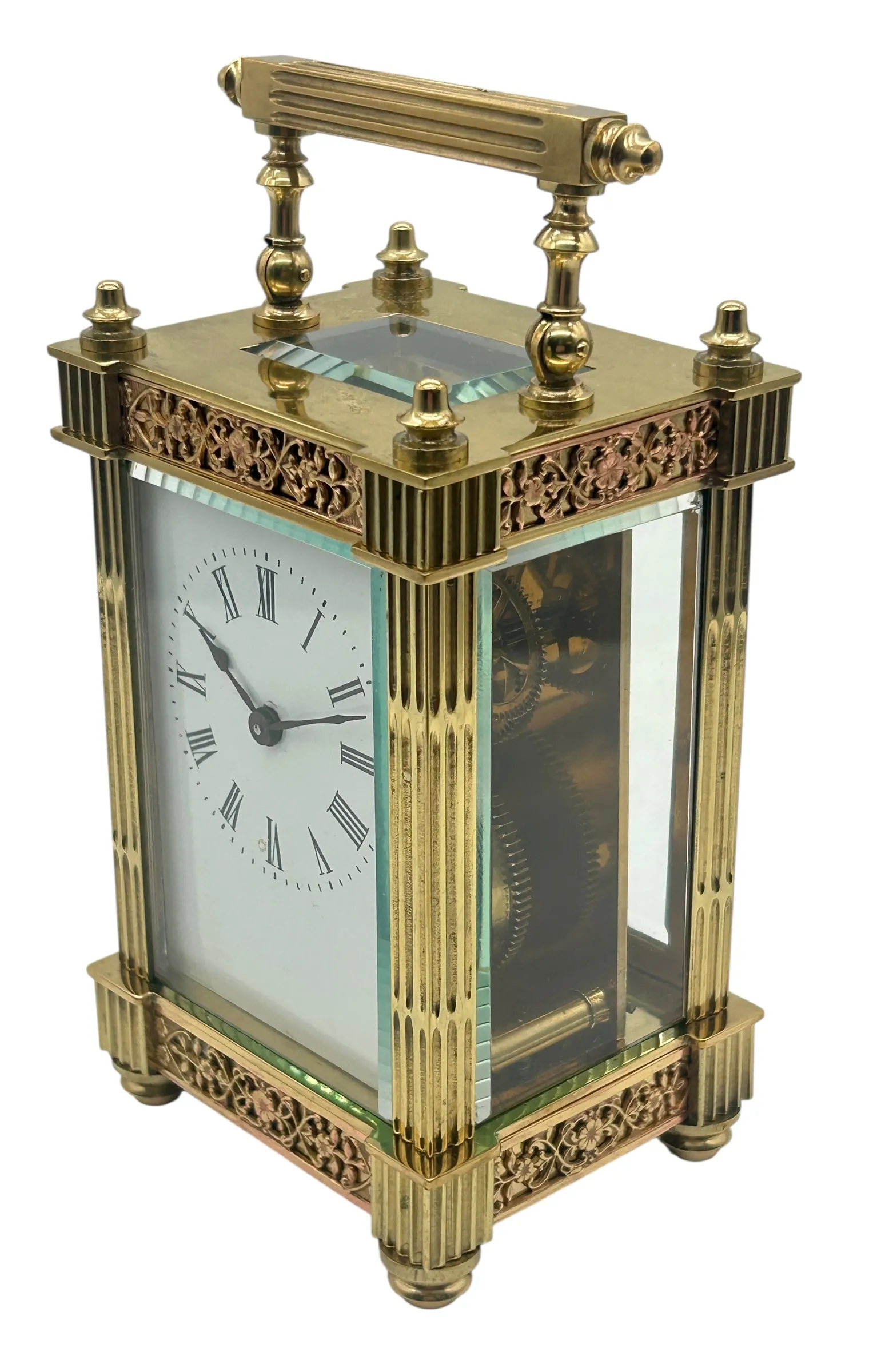 Highly Collectable Carriage Clock with fretwork decoration to all sides with enamel dial – French 8-Day Timepiece Movement.