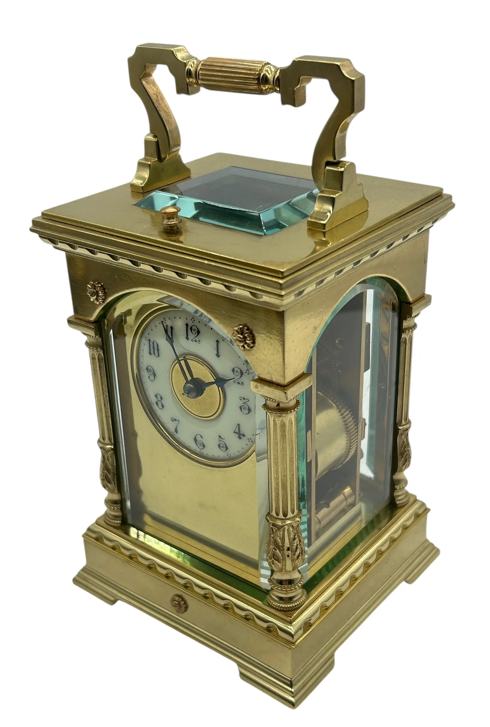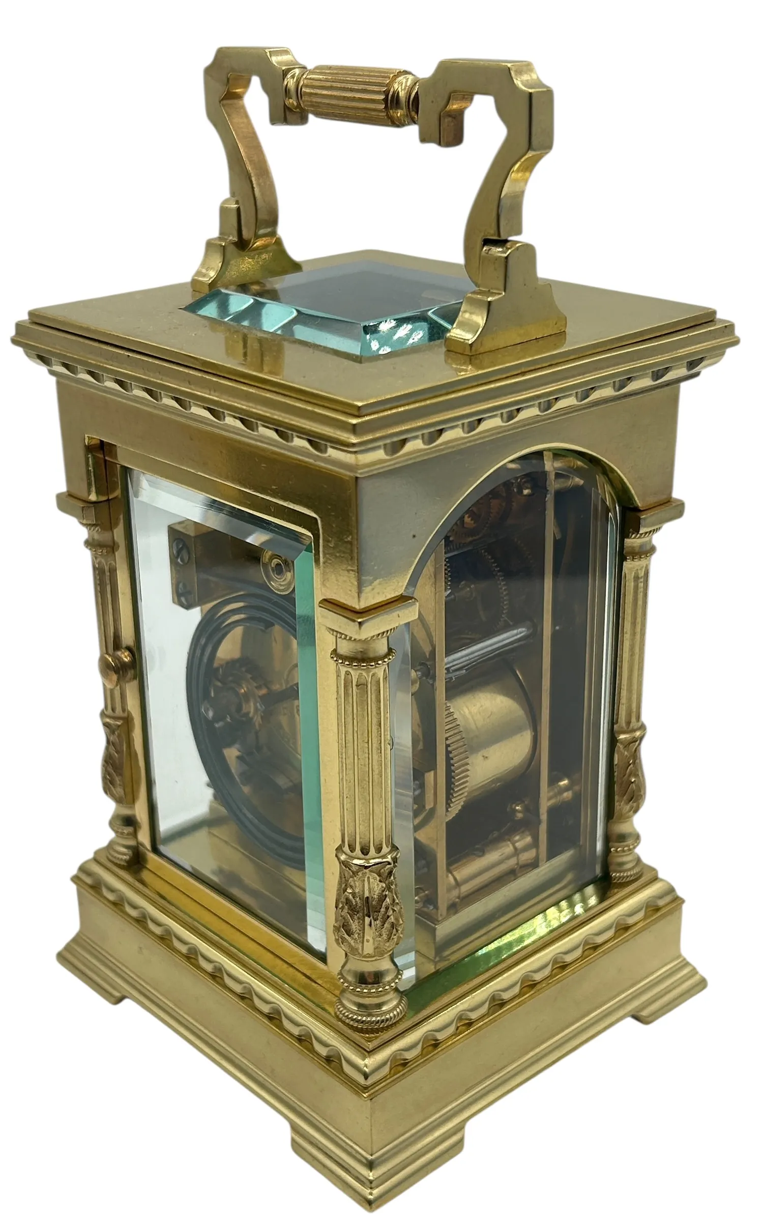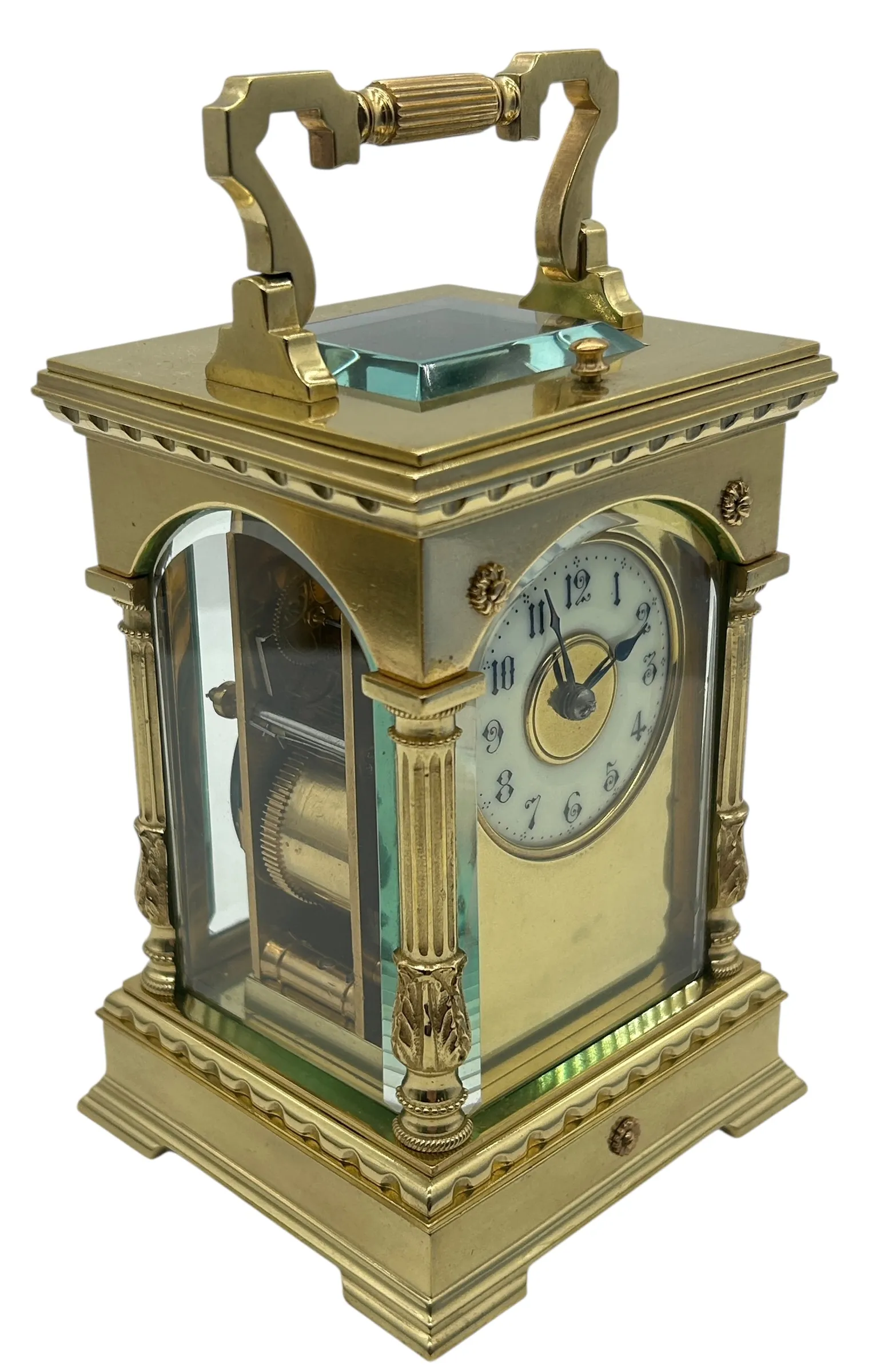 This is an incredible French carriage clock; this is a large model fine architectural case. This clock has many excellent features, but the case is what sells it a truly magnificent looking clock I love the masked dial with white enamel dial. I have fully serviced this clock; it is in terrific condition and full working order. Please view the many photos make sure you are happy with the condition of this clock you can also see a video on my YouTube channel.