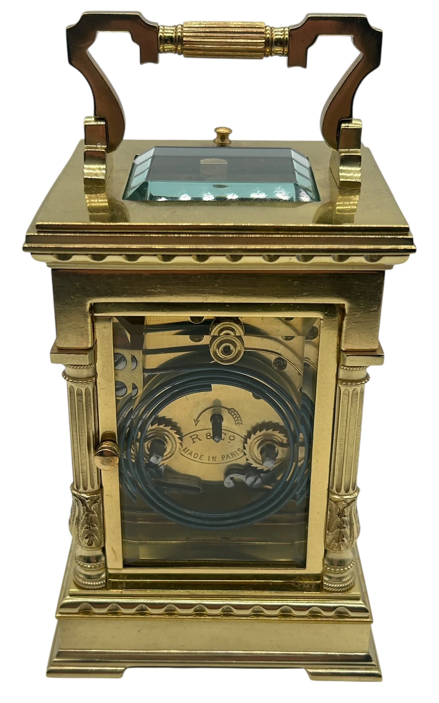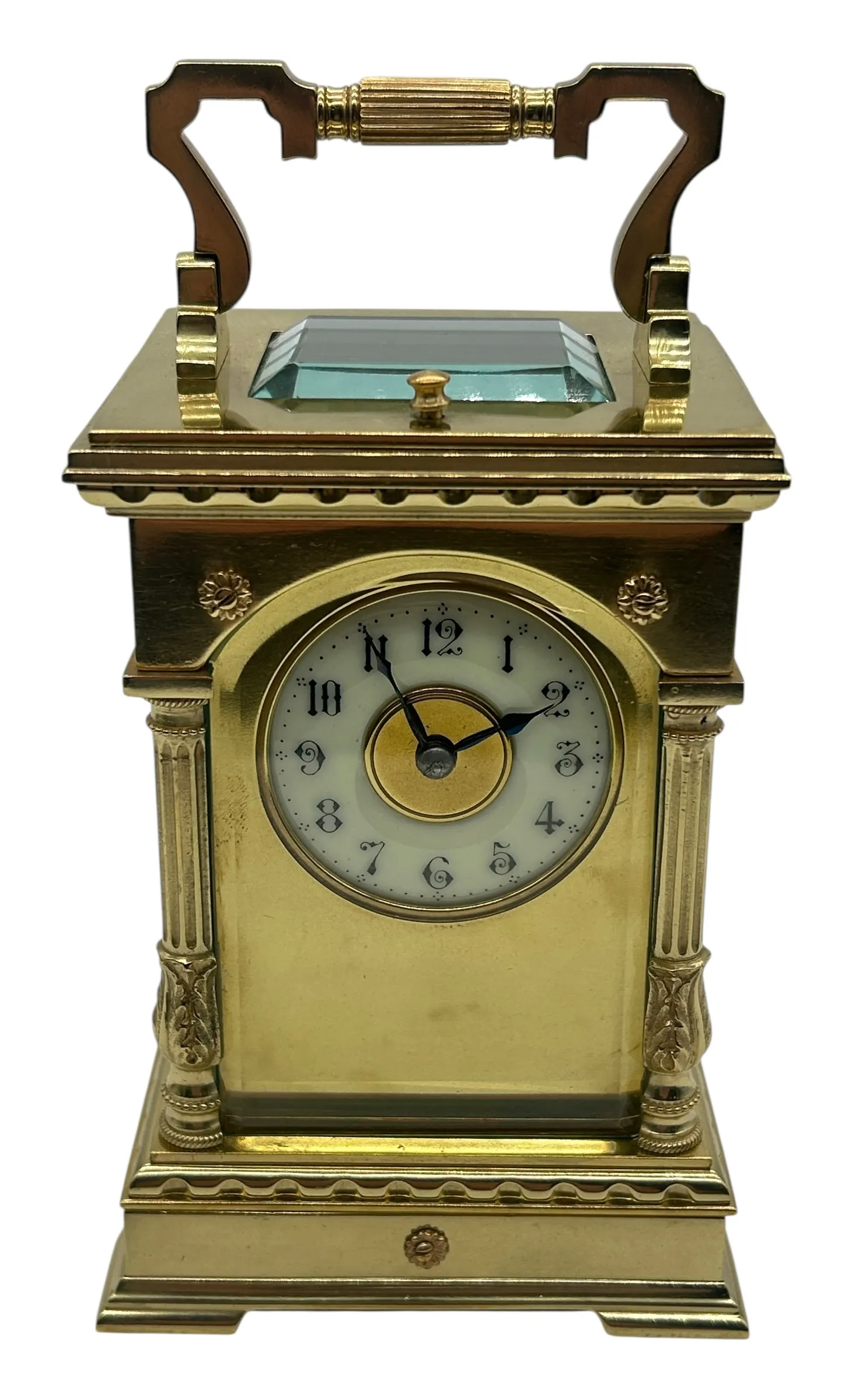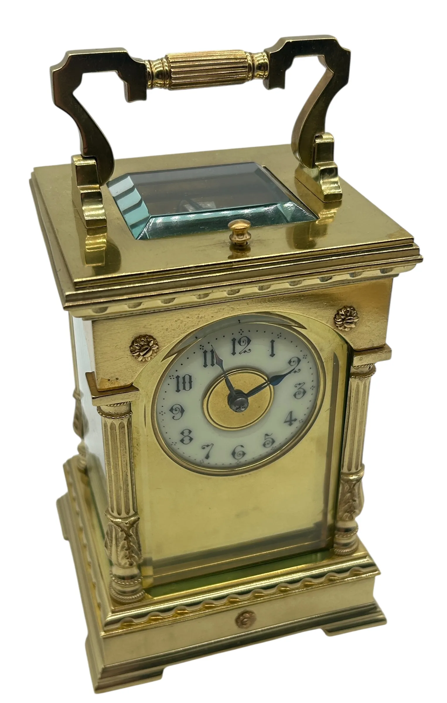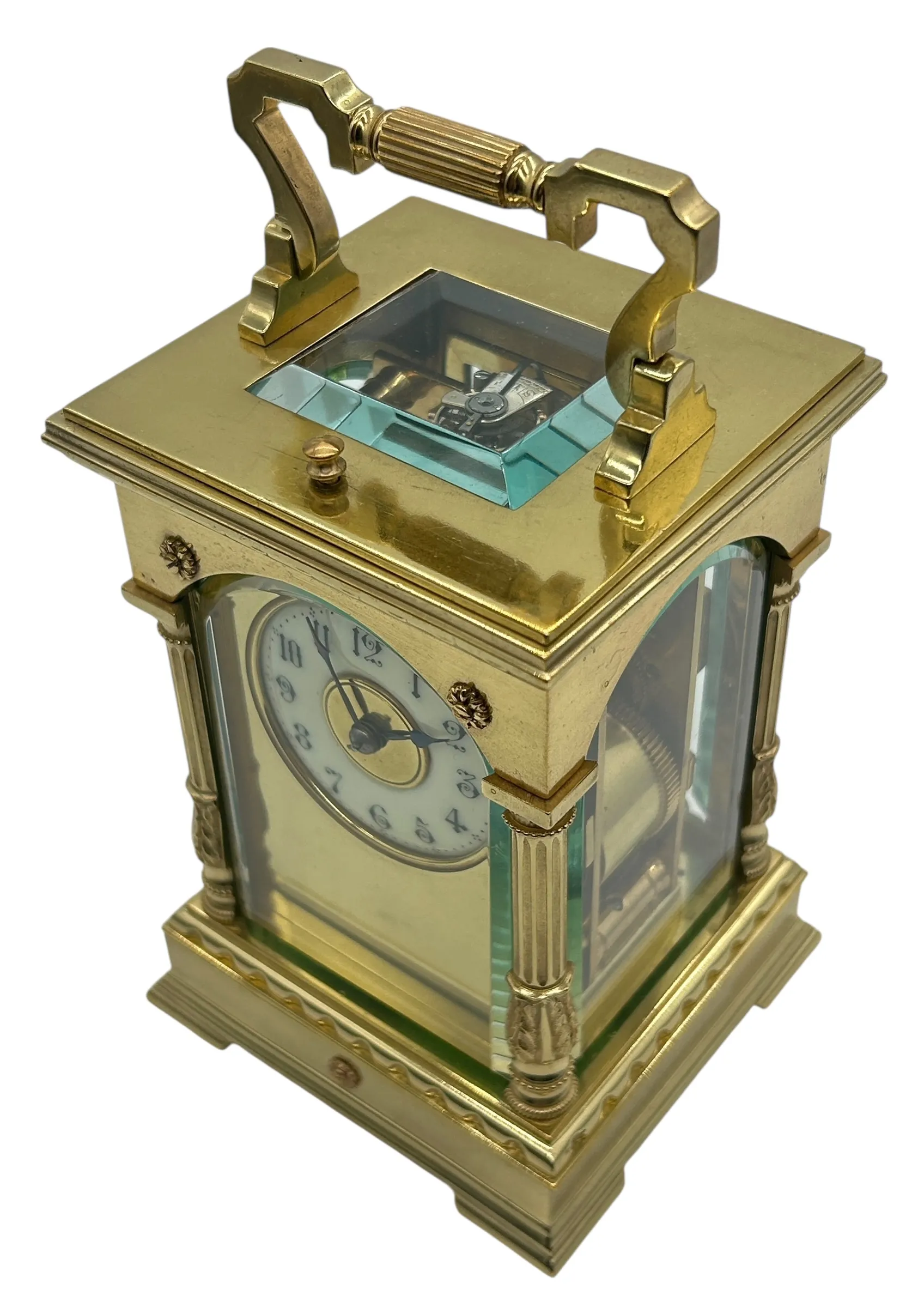 This is an incredible French carriage clock; this is a large model fine architectural case. This clock has many excellent features, but the case is what sells it a truly magnificent looking clock I love the masked dial with white enamel dial. I have fully serviced this clock; it is in terrific condition and full working order. Please view the many photos make sure you are happy with the condition of this clock you can also see a video on my YouTube channel.