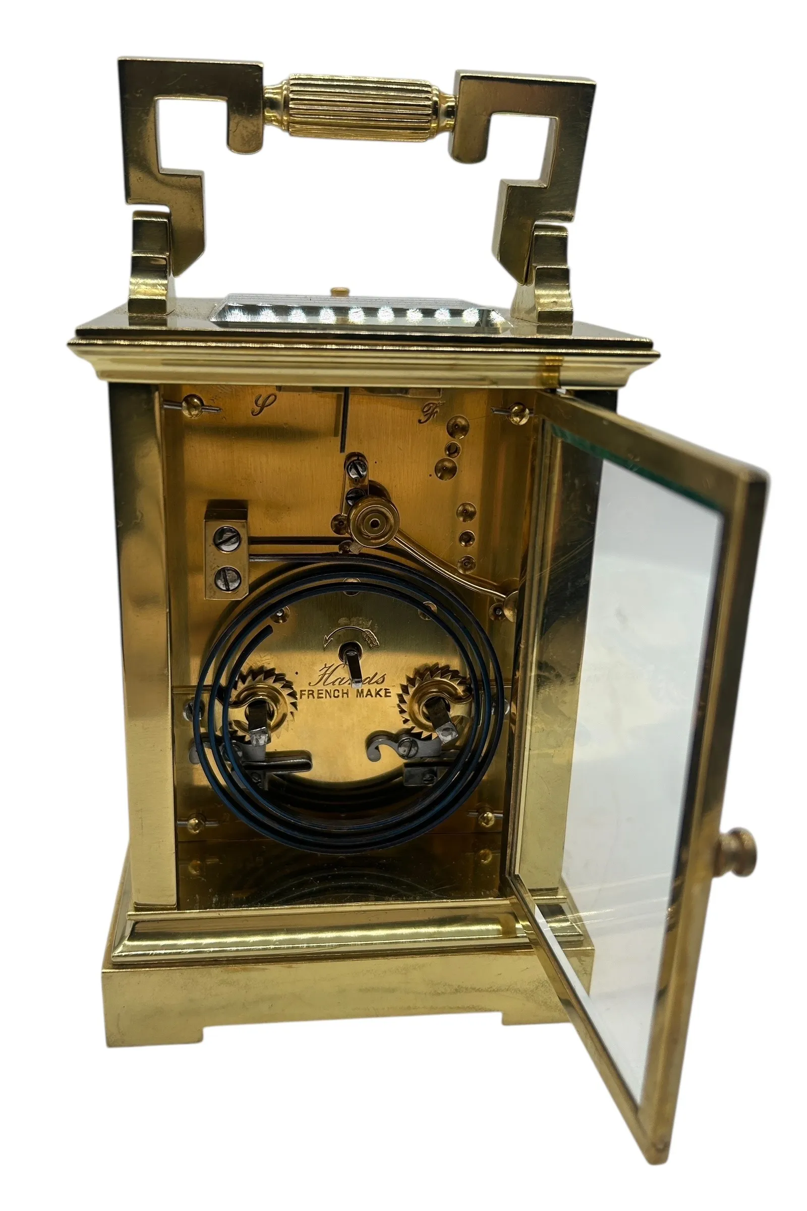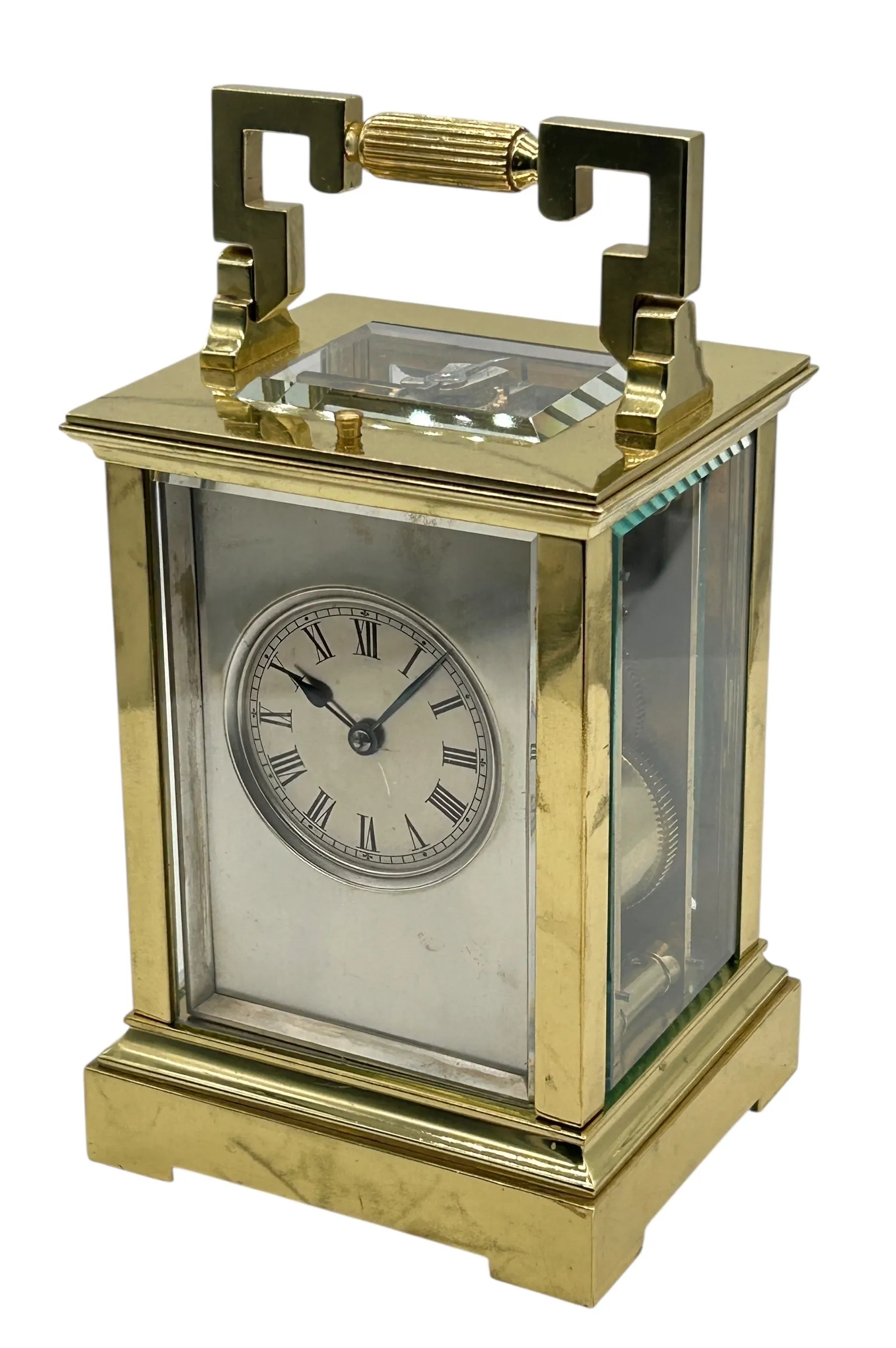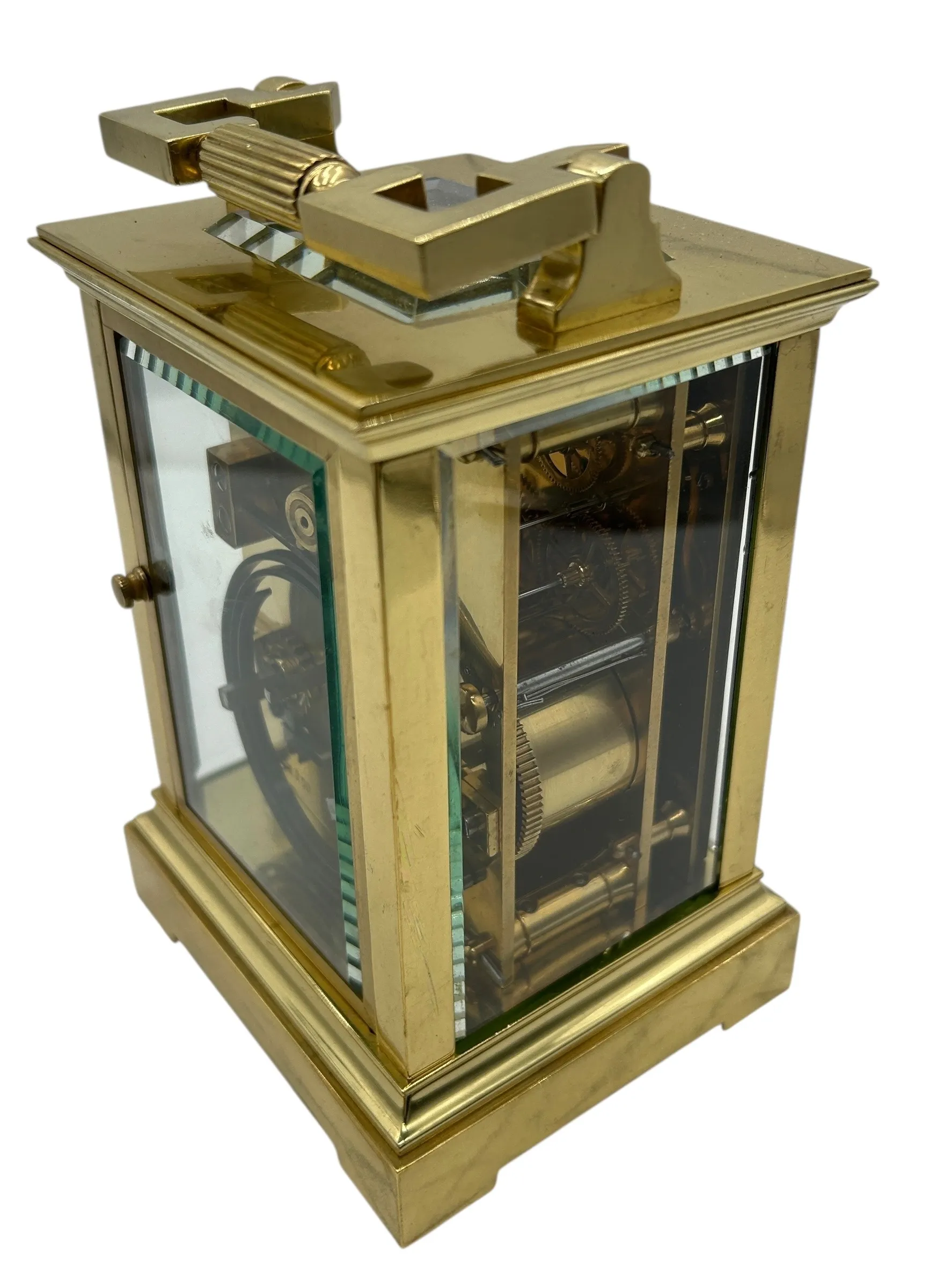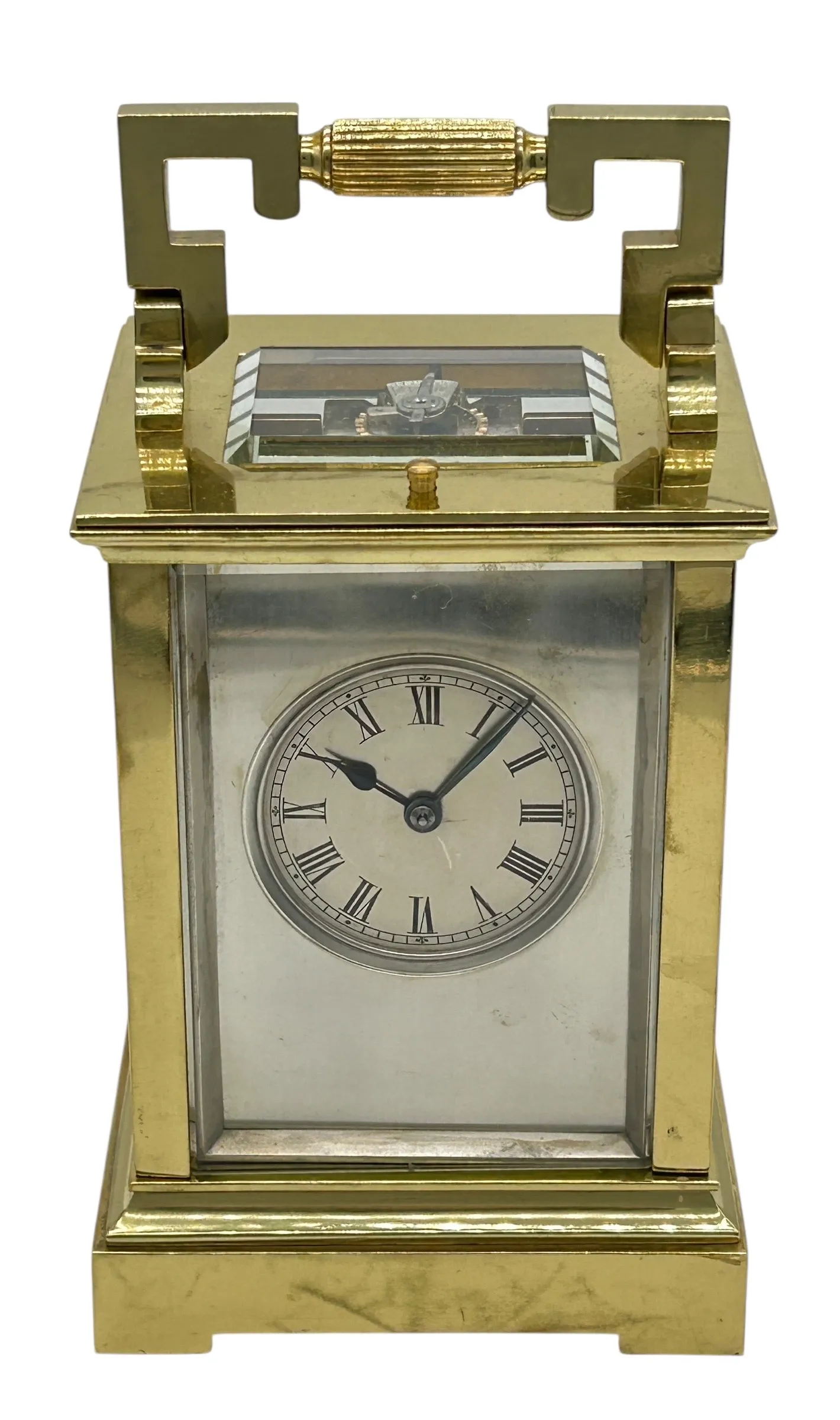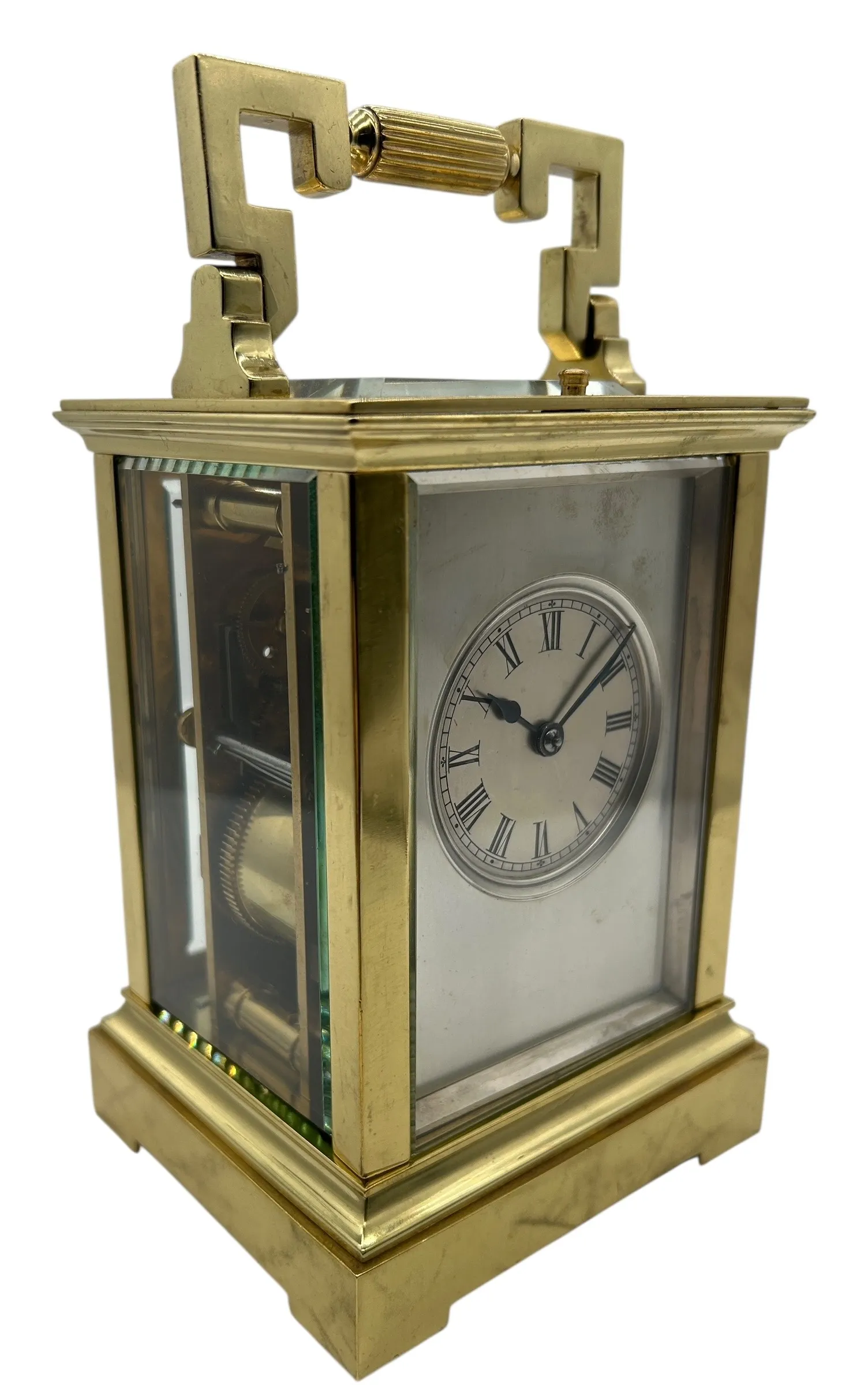 This is an incredible French carriage clock; this large model before with silver masked dial and black Roman numerals. This clock has many excellent features, but the case is what sells it a truly magnificent looking clock. I have fully serviced this clock; it is in terrific condition and full working order. Please view the many photos make sure you are happy with the condition of this clock you can also see a video on my YouTube channel.